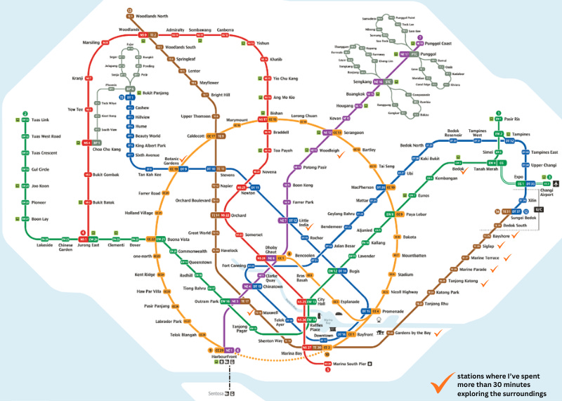 I’ve also checked off the stations where my daily and weekly routines take me, such as Bedok, Marine Parade, Maxwell (Chinatown) and our own stop, Siglap. I may write about these locales in the future, especially Chinatown, but those will come when the spirit moves me, not on some imaginary timeline that I’ve assigned myself.