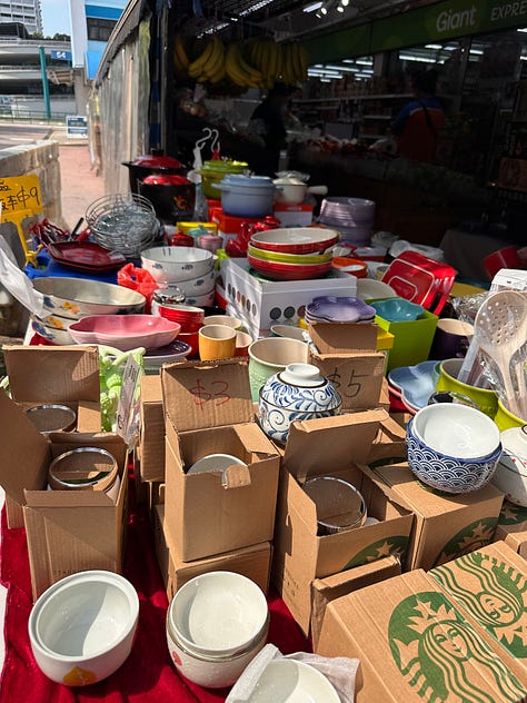 I noticed (and bought) lavender Le Creuset pieces from an uncle displaying his wares on wobbly folding tables. And I noticed knotty old trees carefully protected from the never-ending march of progress.